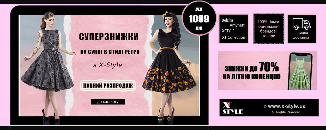 X-Style — интернет-магазин с большим "ассортиментом" стилей на все случаи. У нас Вы можете подыскать наряд для вечеринки в стиле Стиляг, Ретро, Рокабилли, Рок, Готика, Стимпанк, Винтаж, Милитари, Sexy. Мы также можем порадовать Вас большим ассортиментом вечерних нарядов, костюмов на Хэллоуин, а также сексуальной эротической одежды, сценических костюмов и аксессуаров. У нас найдется все — от нижнего белья до верхней одежды в нужном Вам стиле! Необычная одежды в Киеве Мы любим качество и стиль! Мы также любим непохожесть на другое, поэтому для своих коллекций отбираем и разрабатываем новые интересные идеи, которые смогут по-новому раскрыть женскую фигуру как личность. Не бойтесь экспериментировать! В разумных пределах это всегда интересно и даже полезно. Надеемся, наш интернет-магазин станет для Вас в этом лучшим помощником!