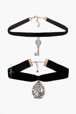 • красивые колье на шею, изготовленные из сплава металлов, кружева и бархата, украшенные филигранными подвесами под старину. Необычно смотрятся также лаковые колье, которые имитируют латекс, но стоят в разы дешевле;