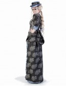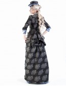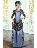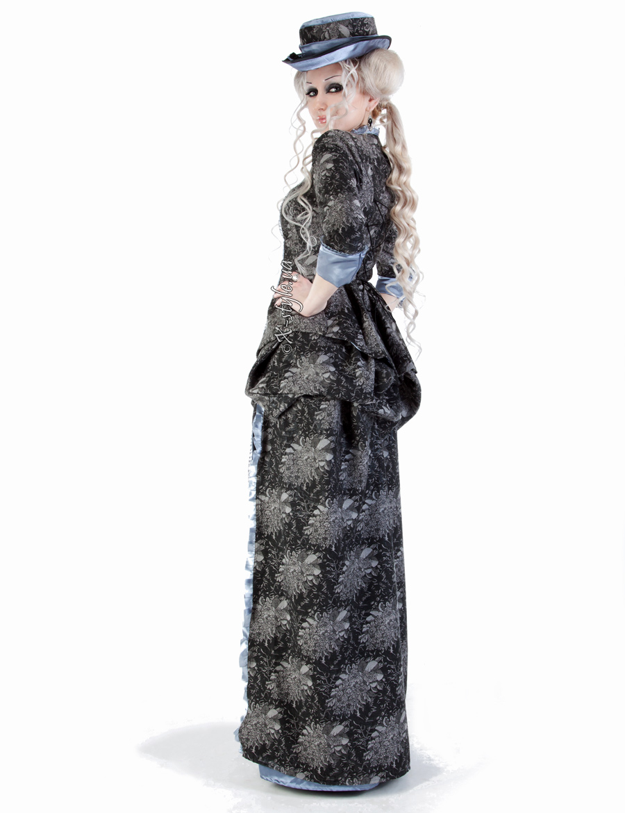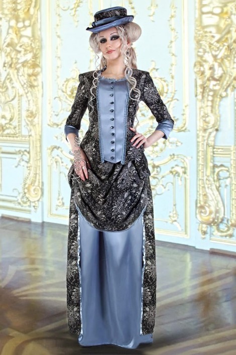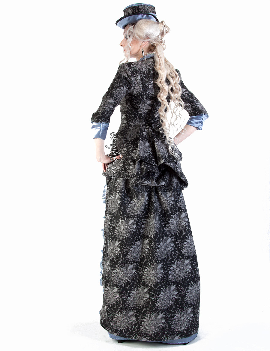 Двоскладова, сильно приталена сукня, з вузькими рукавами довжиною 3/4 і глибоким декольте, ззаду з фалдою, закладеною складками. Конструкція сукні включає ущільнений піджак і двошарову спідницю. Спідниця з турнюром складена з двох частин. Коротка спідниця закладена складками, ззаду призібрана вгору і закріплена.