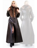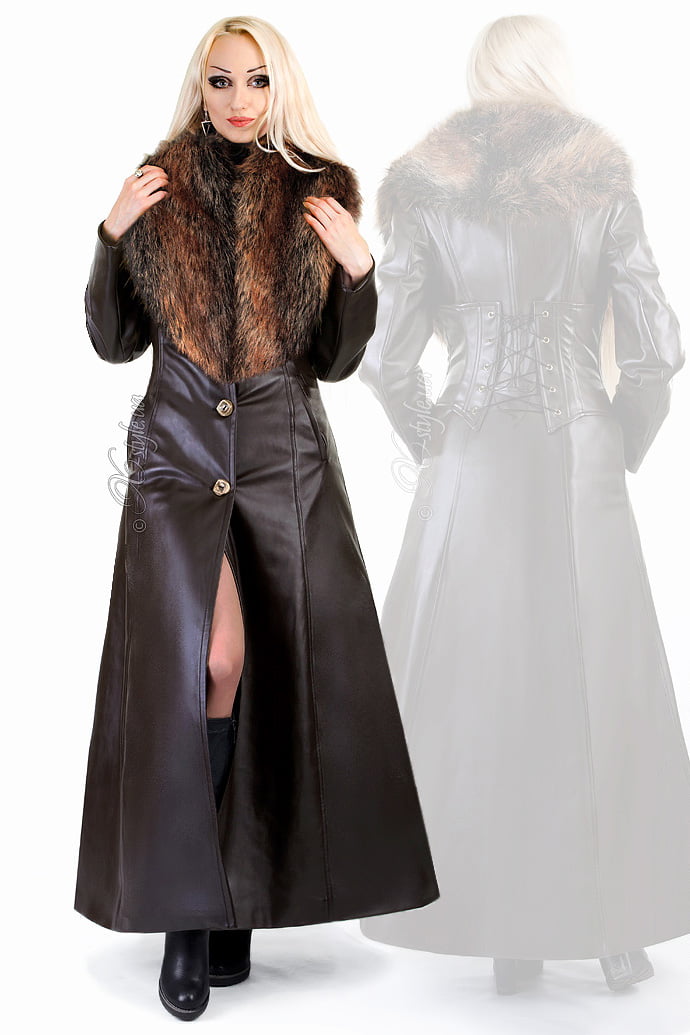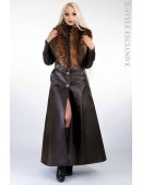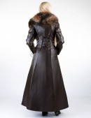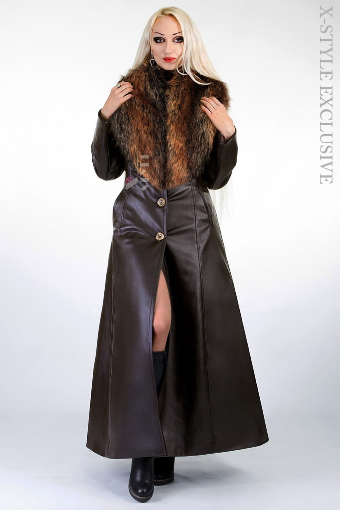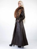 Длинное приталенное, сильно расклешенное к низу пальто, украшенное пышным искусственным мехом лисы.