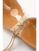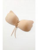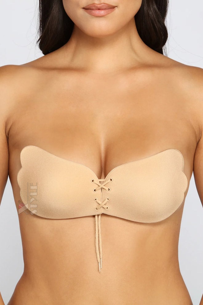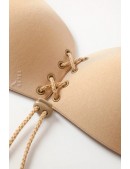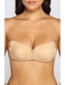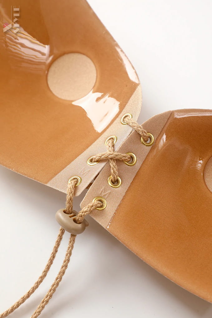 Бюстгальтер невидимка телесного цвета с тканевым шелковистым верхом и шнуровкой по центру. С помощью такого бюстгальтера можно приподнять грудь, придать более пышную форму, создать "ложбинку". Незаменимый аксессуар для платьев с открытой спиной и откровенным декольте.