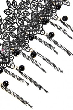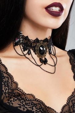 • красивые колье на шею, изготовленные из сплава металлов, кружева и бархата, украшенные филигранными подвесами под старину. Необычно смотрятся также лаковые колье, которые имитируют латекс, но стоят в разы дешевле;
