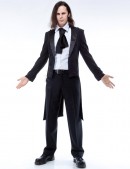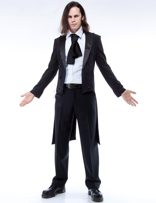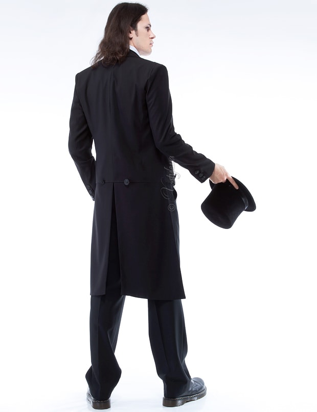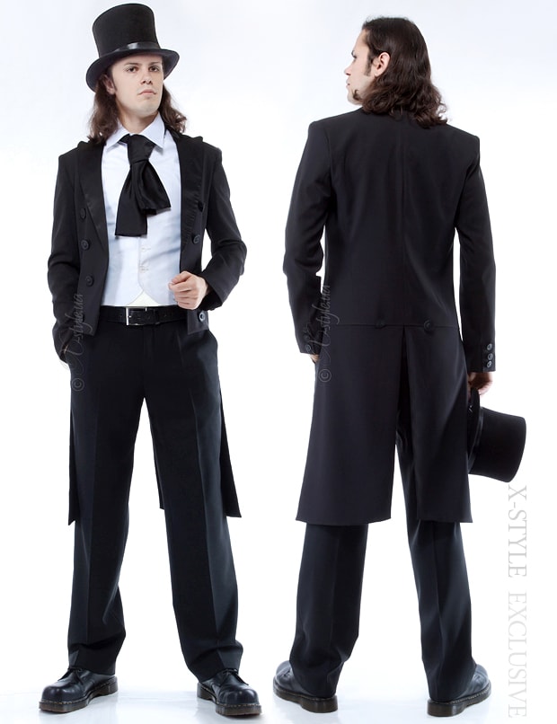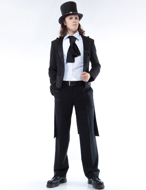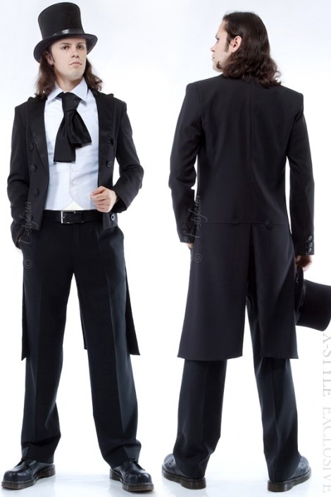 Фрак классический, борта не застегиваются, на полочках вертикально расположены по четыре пуговицы. Воротник фрака классический «английский», угол лацкана заостренный, в форме «ласточкин хвост». В комплекте белая жилетка, манишка и черный атласный шарф. Жилетка застегивается на четыре пуговицы.