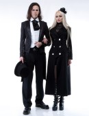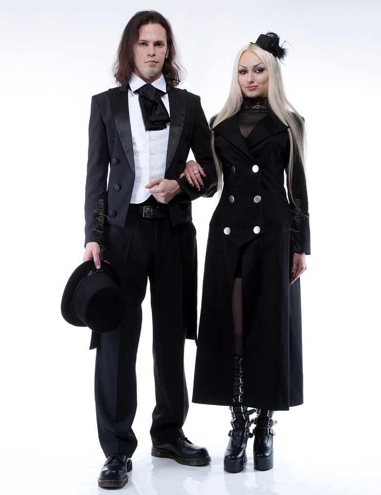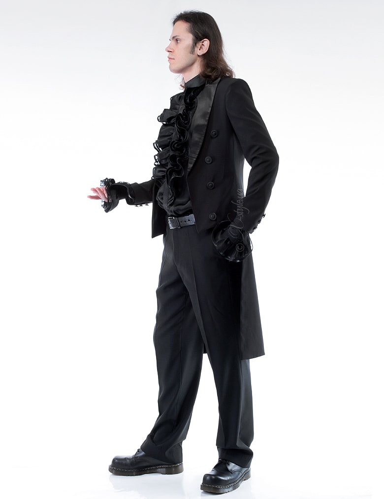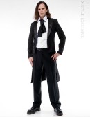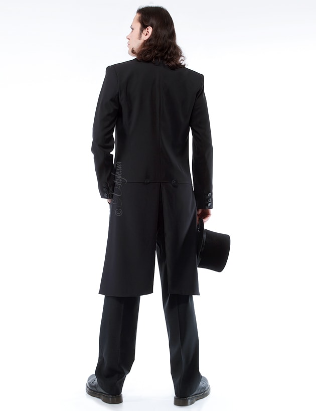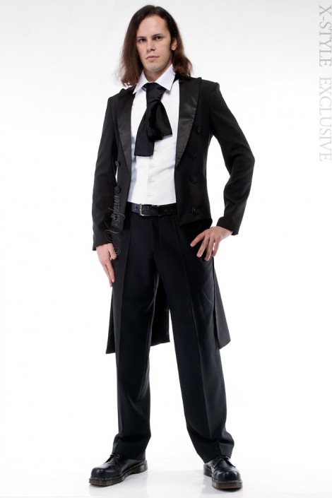 Мужской классический черный фрак от X-Style. Выполнен из "тяжелой" полушерстяной ткани, имеет классический «английский» воротник. Угол лацканов заострённый, формы «ласточкин хвост», выполнен из атласа. Спереди по четыре пуговицы.