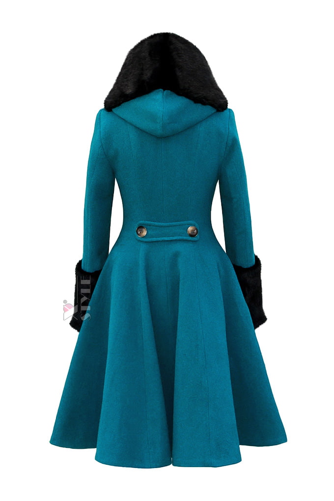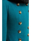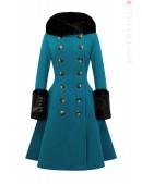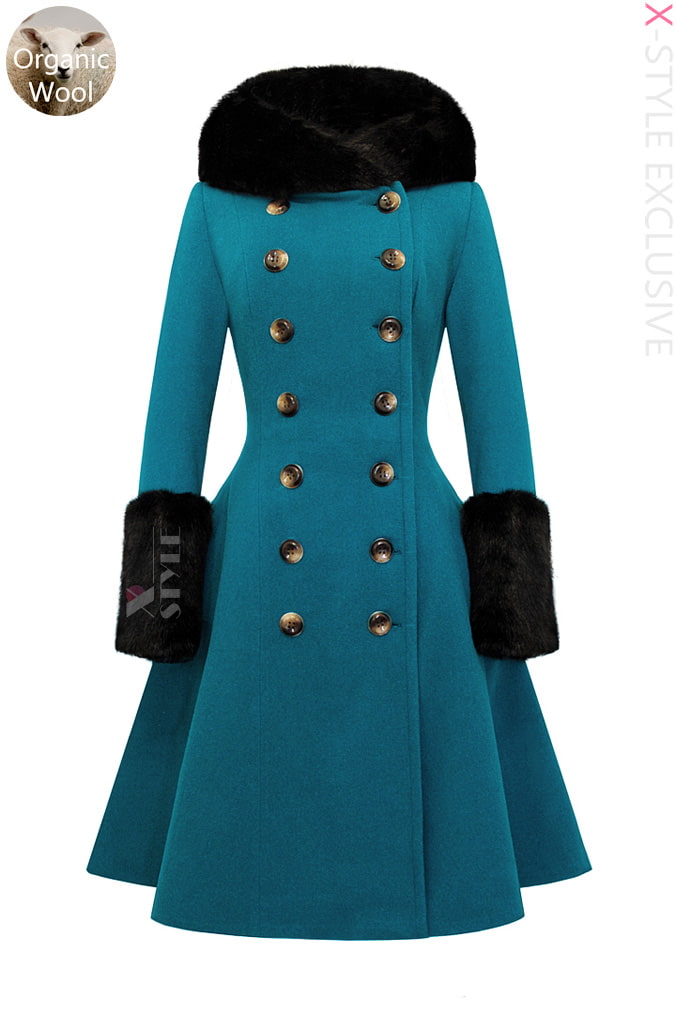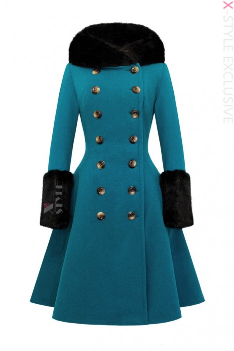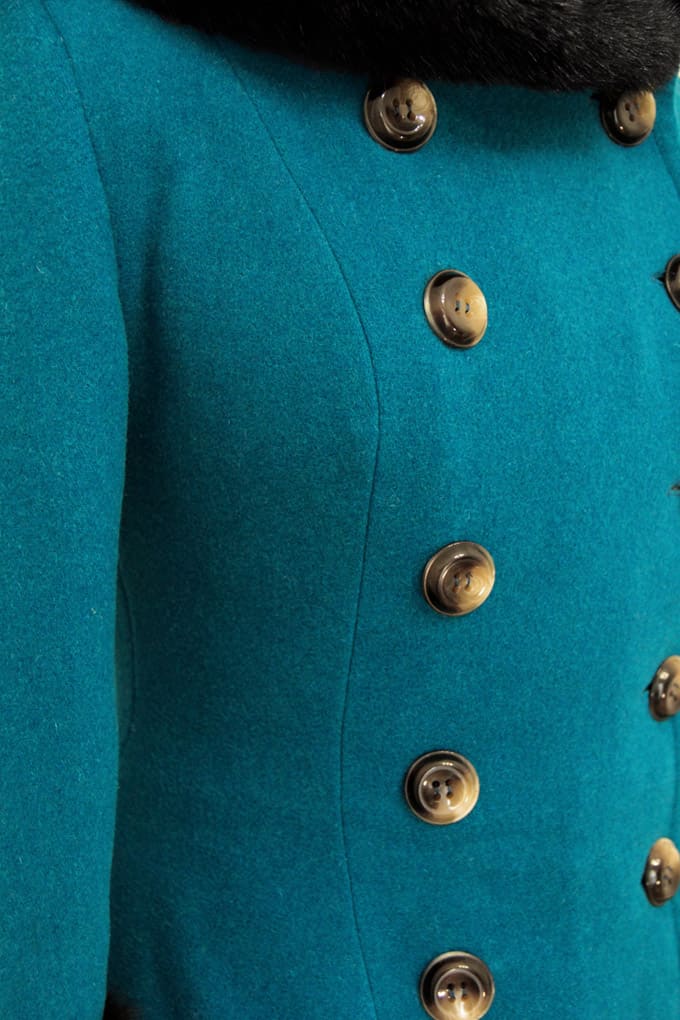 Зимнее очень теплое двубортное пальто с застежкой на пуговицы и мехом под норку. Изготовлено из натуральной качественной шерстяной пальтовой ткани, утеплено синтепоном.